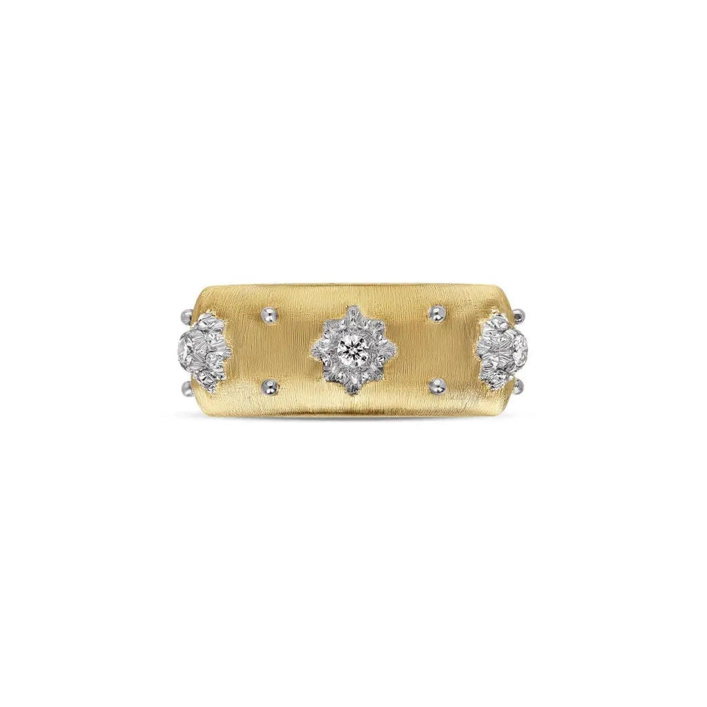 Part of the Macri Collection, this ring's surface is wavy, hand-engraved, and embellished with brilliant-cut diamonds set in tiny star-shaped rosettes. Small and shiny gold beads play with the opaque texture and the light of the diamonds. Measurements: Ring width is 8.0 mm; Metal: 18k yellow and white gold; Diamonds: 0.2 total carat weight.