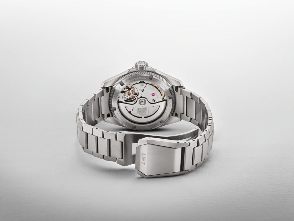 Movement: Centre hands for hours, minutes and seconds, date window, instantaneous date, date corrector, fine timing device and stop-second