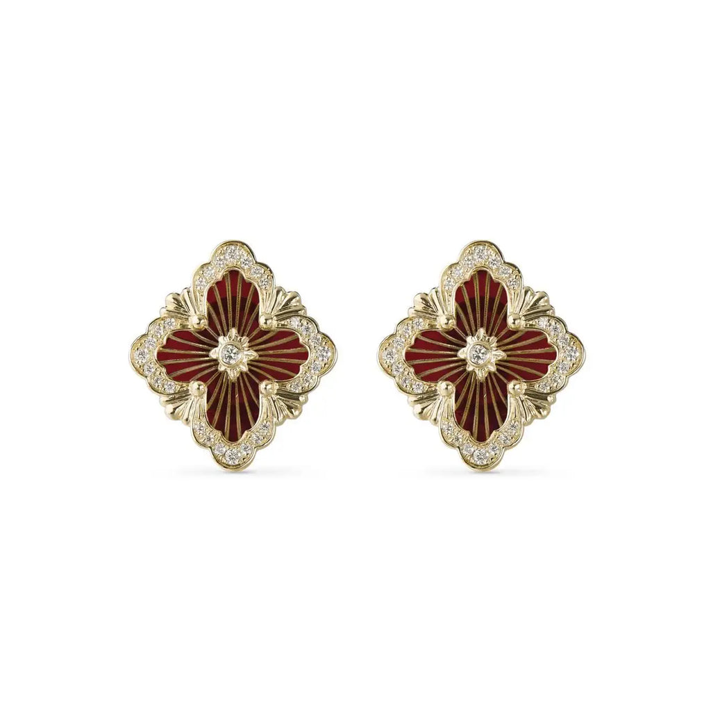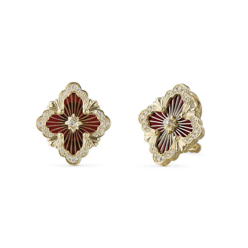 Opera Tulle button earrings composed of a logo element in yellow gold and fan-shaped scalloped borders set with diamonds. The red enamel element is topped with radial tulle, centering a yellow gold morette set with a diamond. Shiny beads in yellow gold.