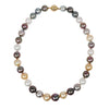 Lovely single strand of large, multi-color pearls. The pearls are graduated in size and range from 10.5 mm - 12.0 mm and have a good luster. The clasp is 14 karat yellow gold and magnetic while the length of the necklace is 14 inches.