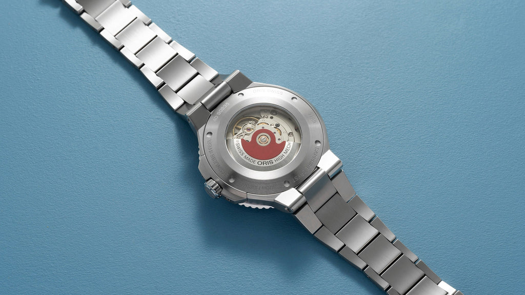 Case: Multi-piece stainless steel case, ceramic minutes scale top ring. Sapphire, domed on both sides, anti-reflective coating inside. Stainless steel, screwed, see-through mineral glass.