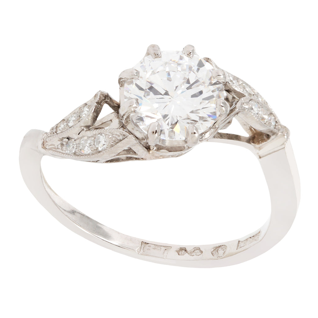 Embrace the romance of a bygone era with our stunning vintage split shank milgrain diamond leaf motif engagement ring. Inspired by the elegance of yesteryears, this exquisite piece features intricate detailing and a captivating leaf motif adorned with sparkling diamonds. The split shank design adds a touch of modern flair while maintaining a timeless allure. Let this singular diamond symbolize your everlasting love in a ring that embodies both vintage charm and contemporary sophistication.