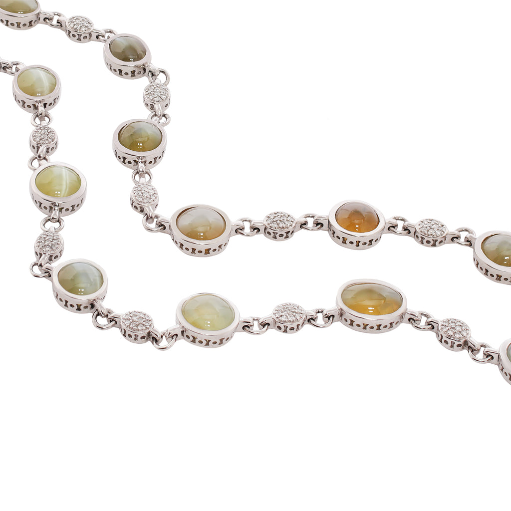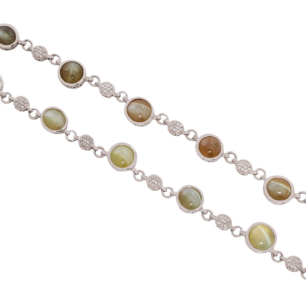 This Chrysoberyl Cat's Eye Necklace is perfect for gem hunters and collectors, with its fascinating, ever-changing bright eye, visible under a spotlight. The colors range from honey-colored to light brown and bring an understated elegance to this unusual piece. The cat's eye gemstones have a total weight of 45.27 carats; they are accented by 210 full-cut diamonds with a total weight of 1.00 carat. The necklace measures 21 inches in length. See matching bracelet, CBDO0119.